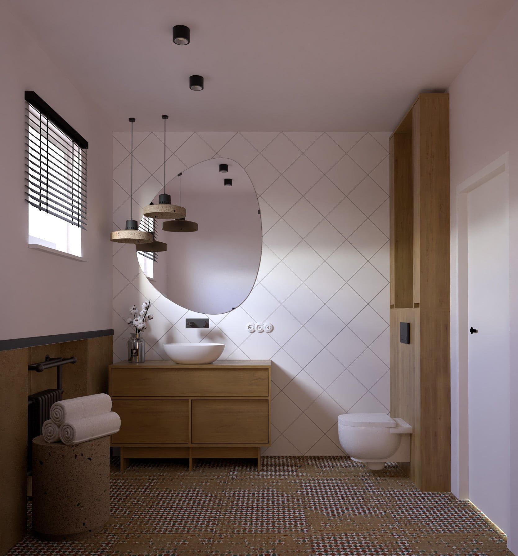 Łazienka z drewnianą szafką i okrągłym lustrem
