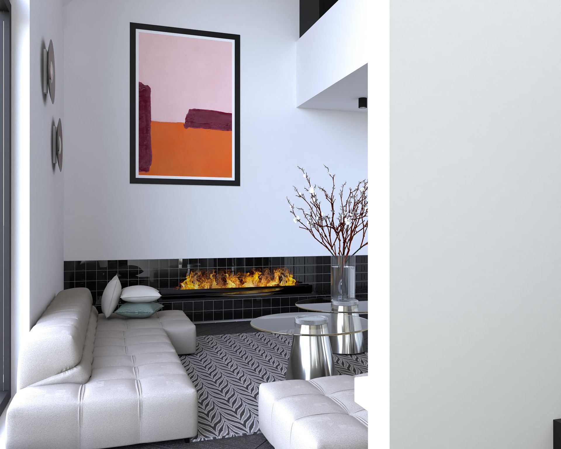 Salon z jasną kanapą i nowoczesnym kominkiem