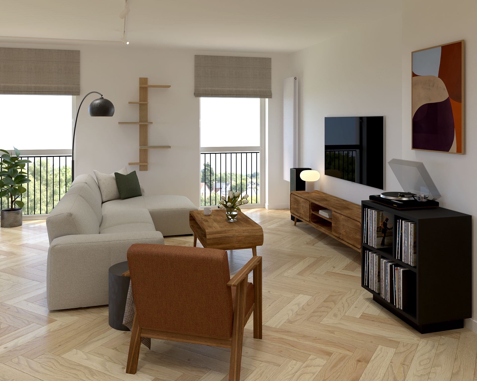 Salon z jasnym narożnikiem i drewnianym stolikiem