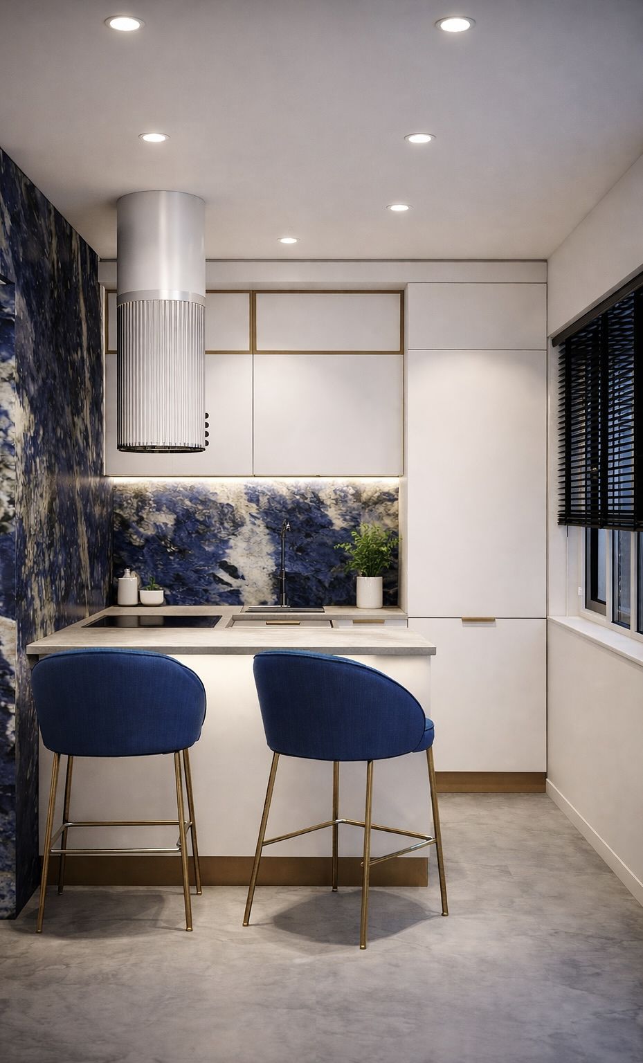 Kuchnia z niebieskimi krzesłami i białymi meblami