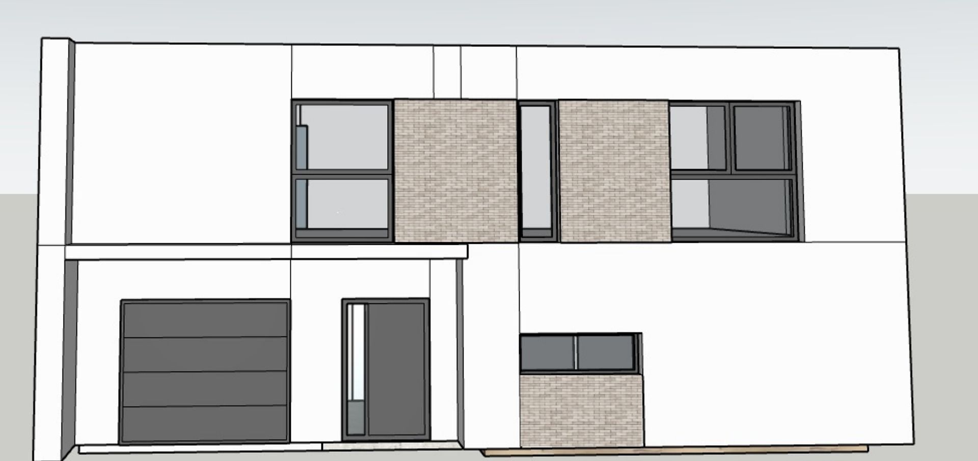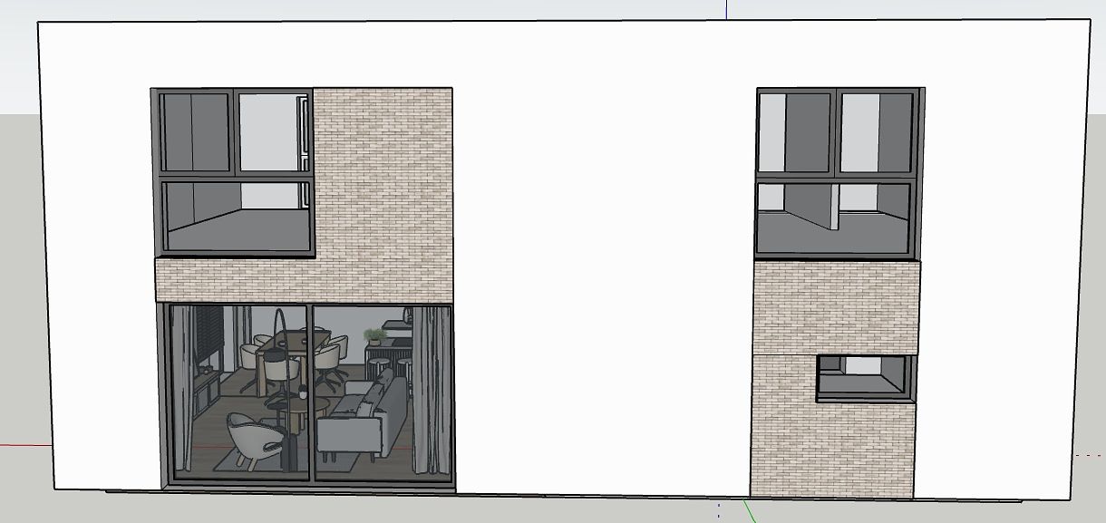 Fasada domu z dużymi oknami i ceglaną elewacją