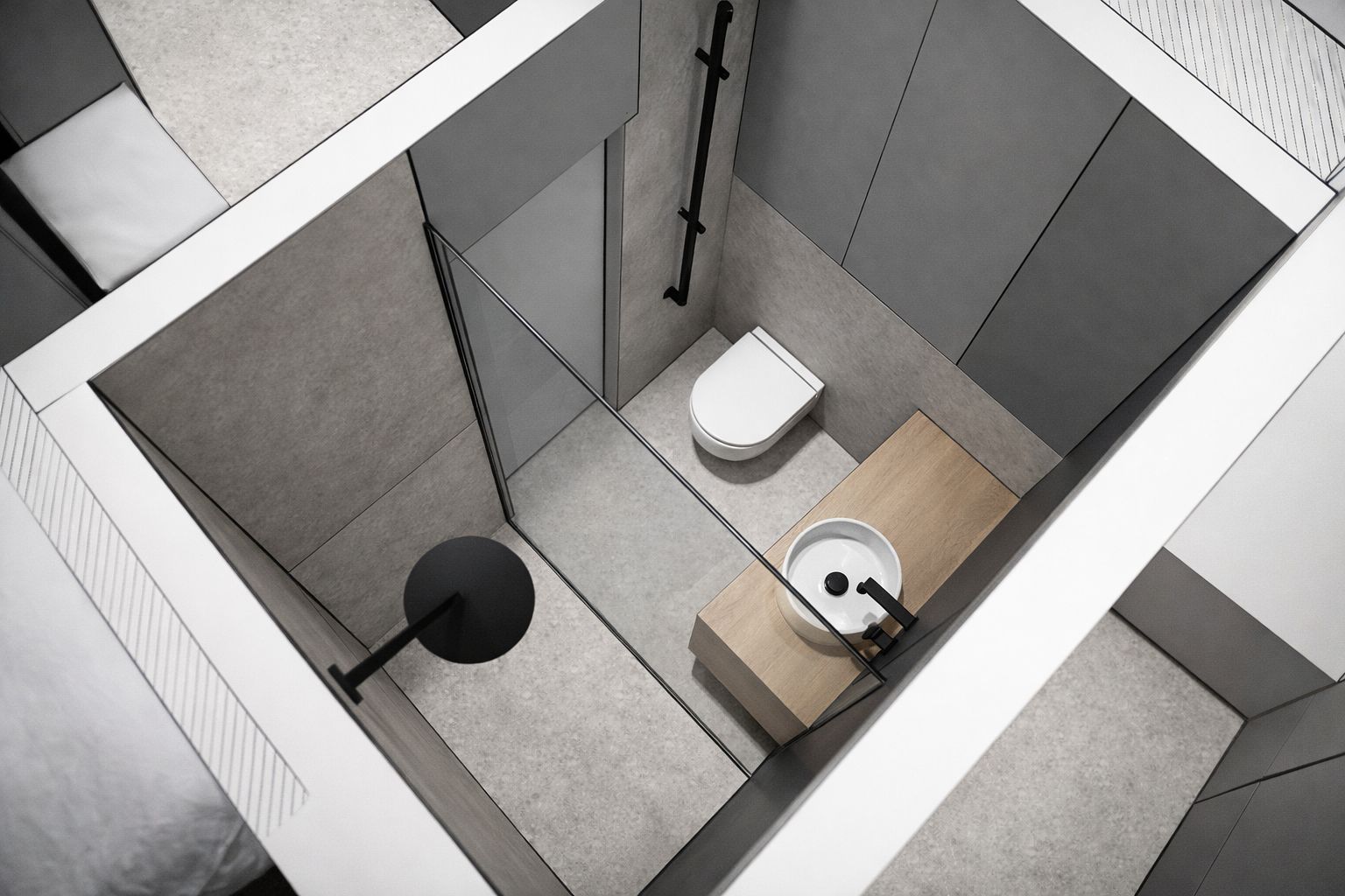 Łazienka z szarymi ścianami i drewnianą umywalką