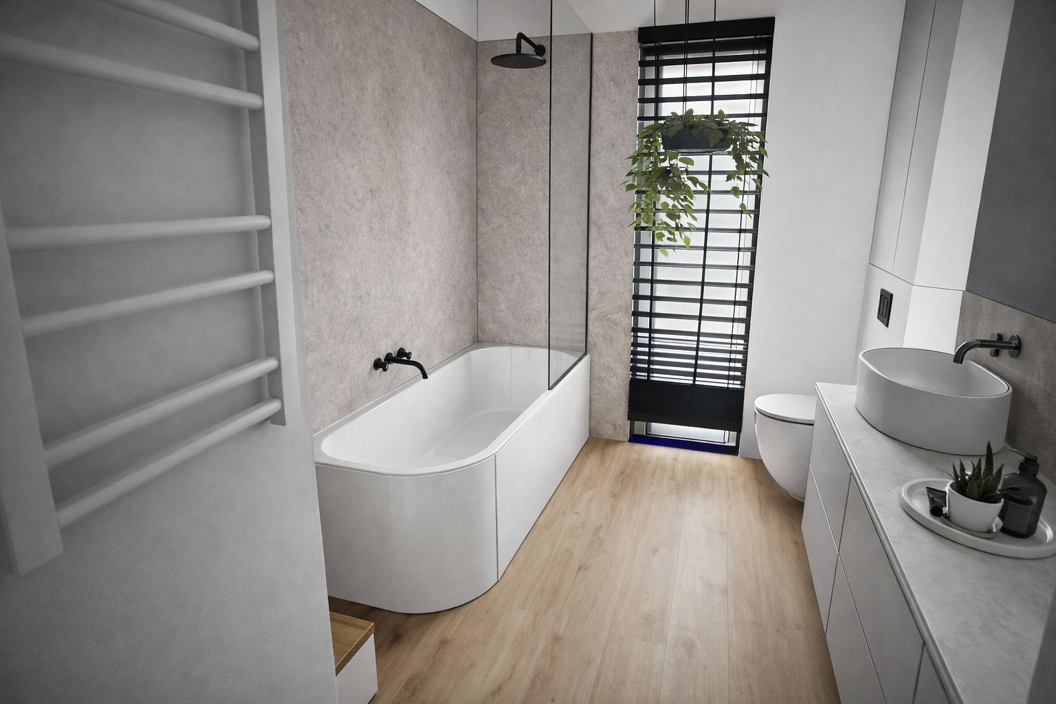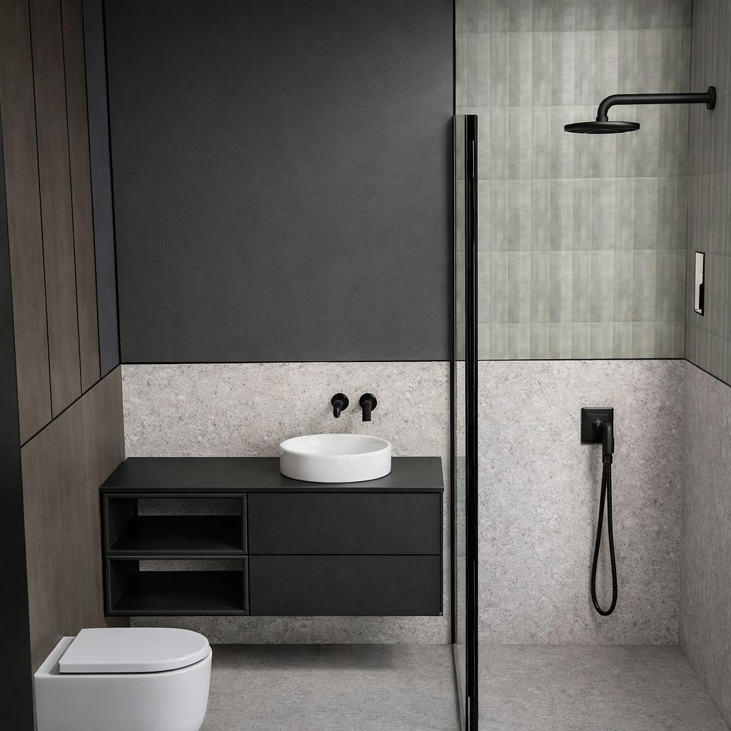 Łazienka z czarną armaturą i szarymi płytkami