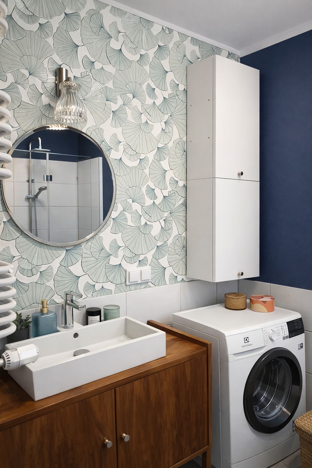 Łazienka z drewnianą szafką i okrągłym lustrem