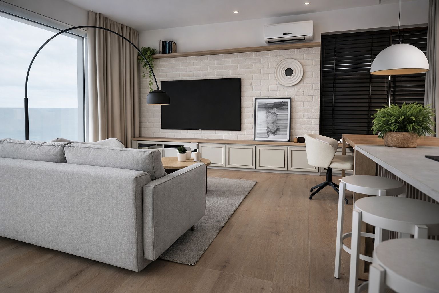 Salon z białą sofą i drewnianym stołem