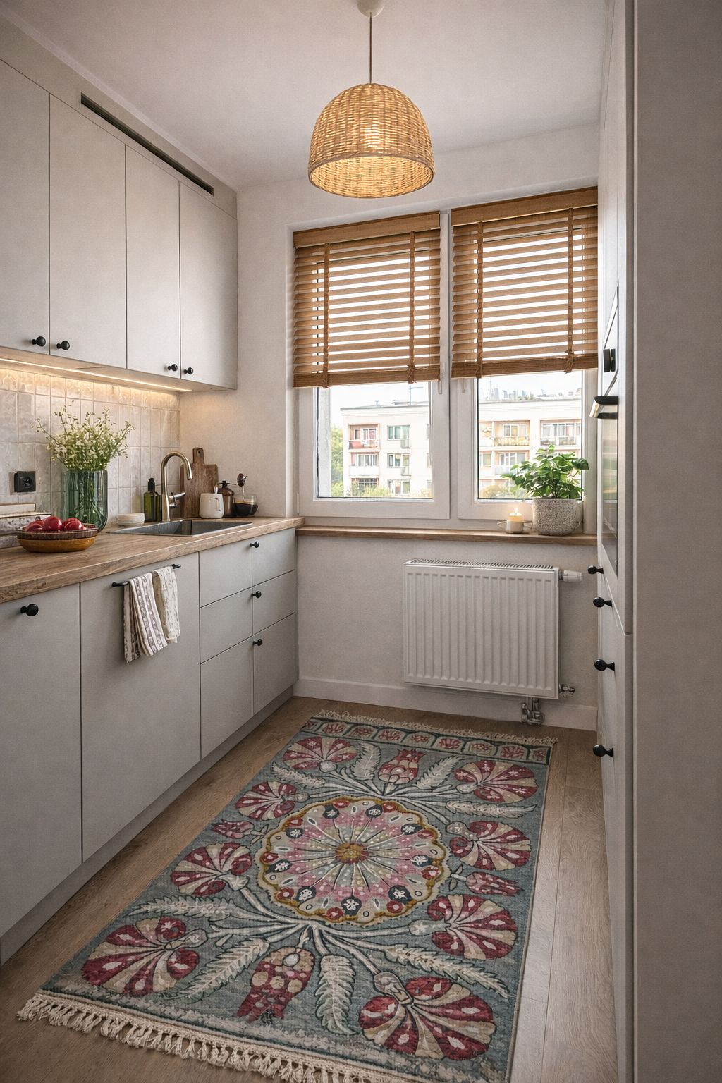Kuchnia z szarymi meblami i drewnianym blatem