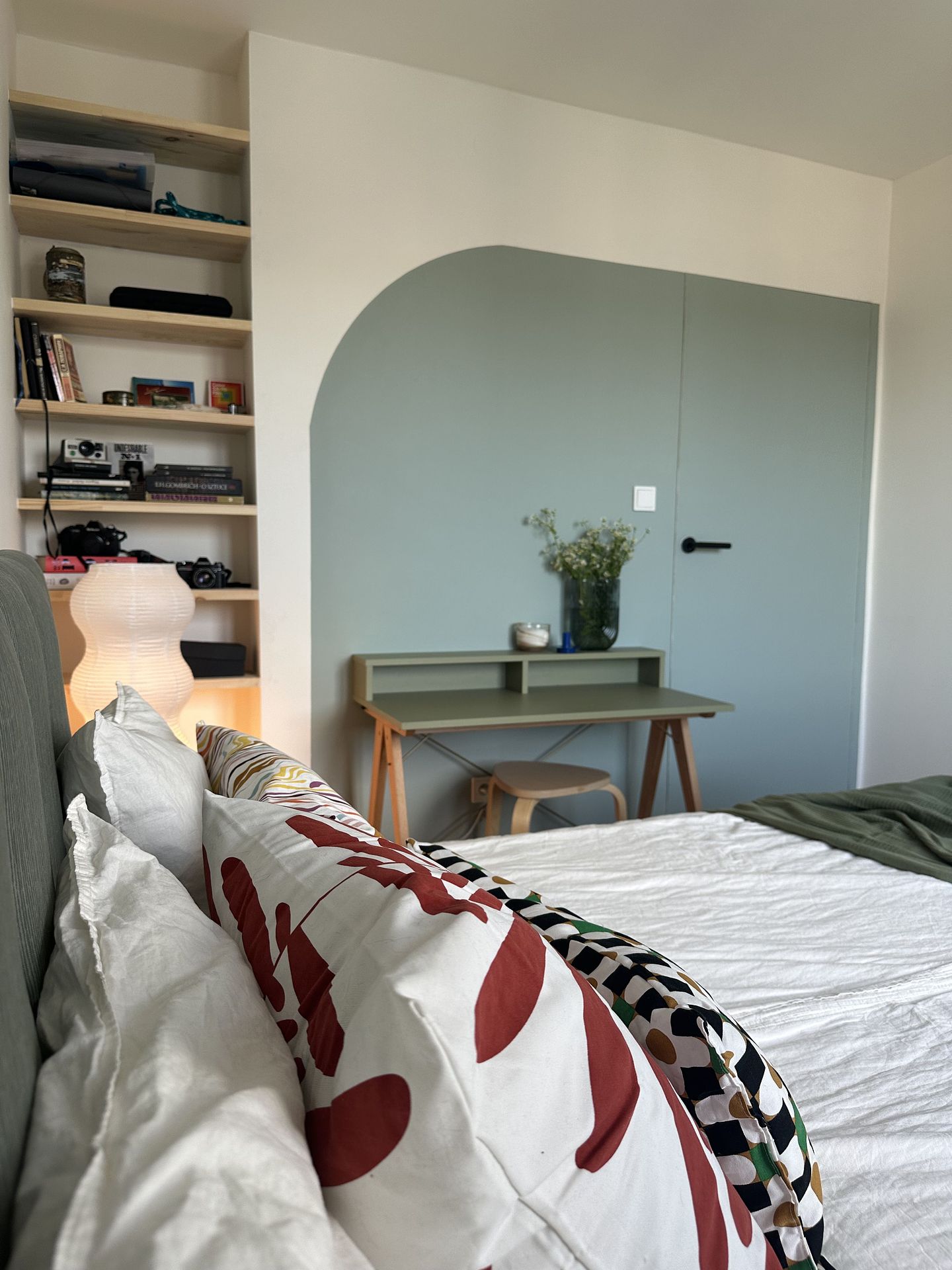 Sypialnia z zielonym biurkiem i kolorowymi poduszkami