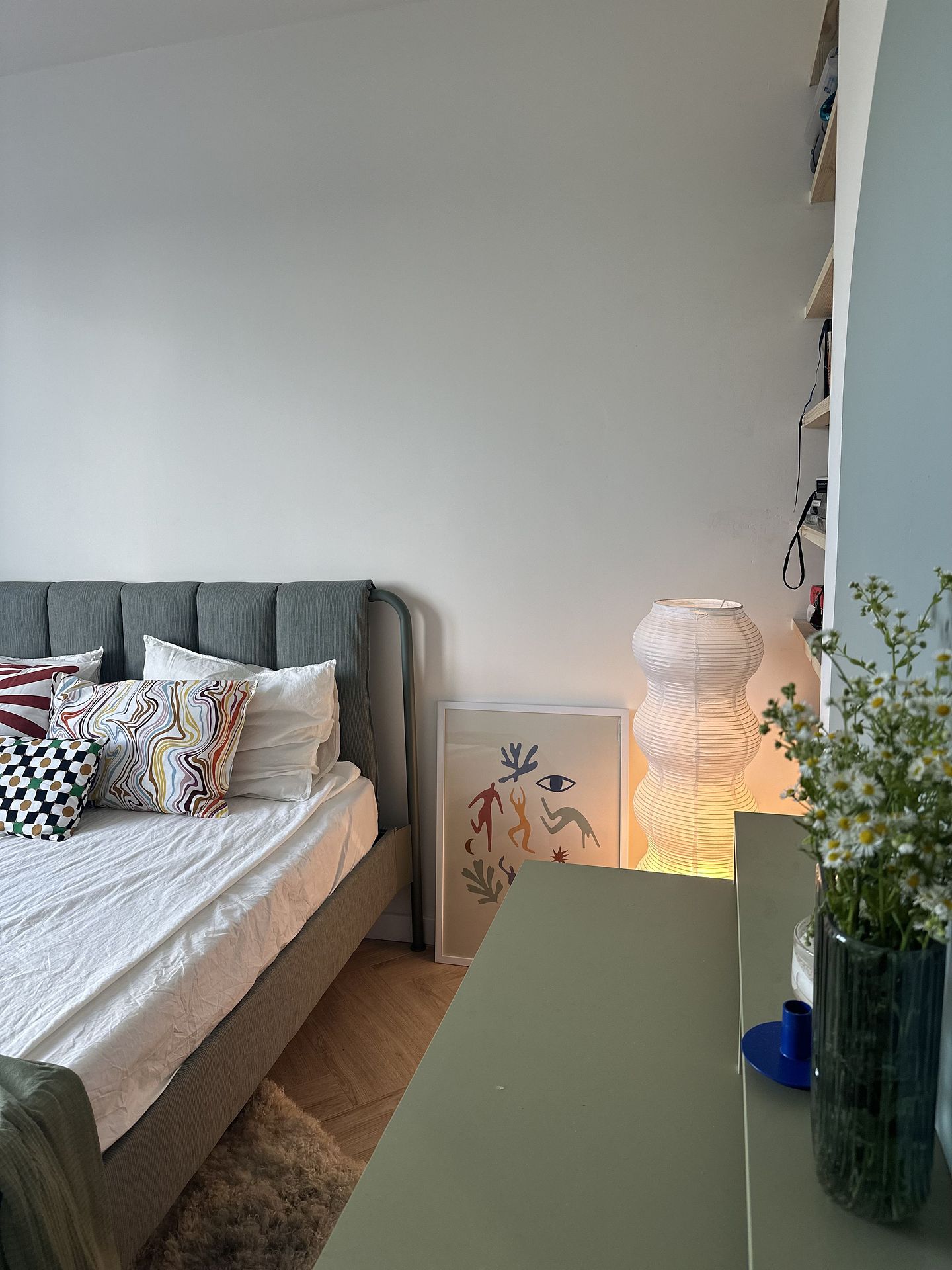 Sypialnia z szarym łóżkiem i kolorowymi poduszkami