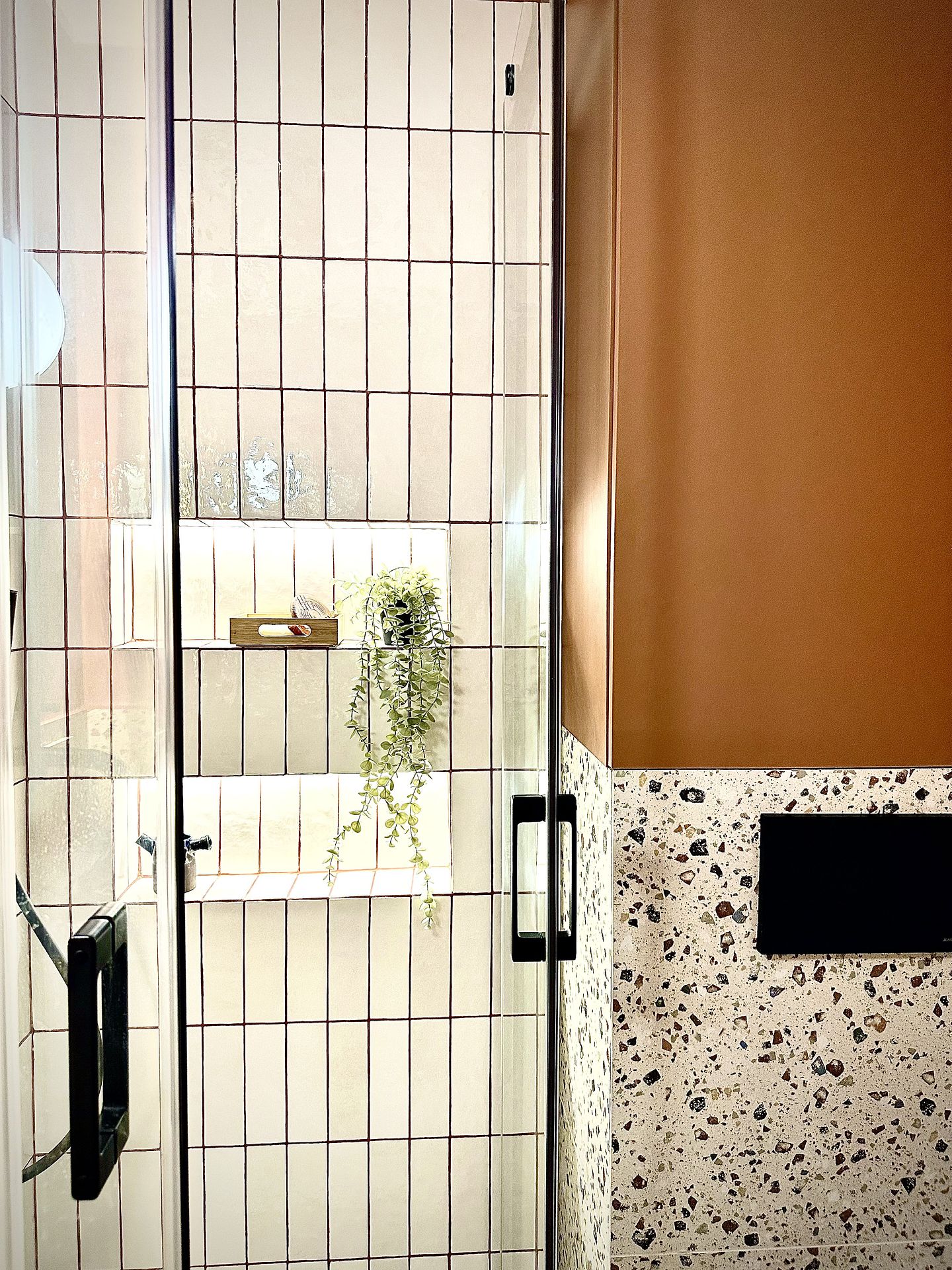 Łazienka z drewnianymi akcentami i dużym prysznicem