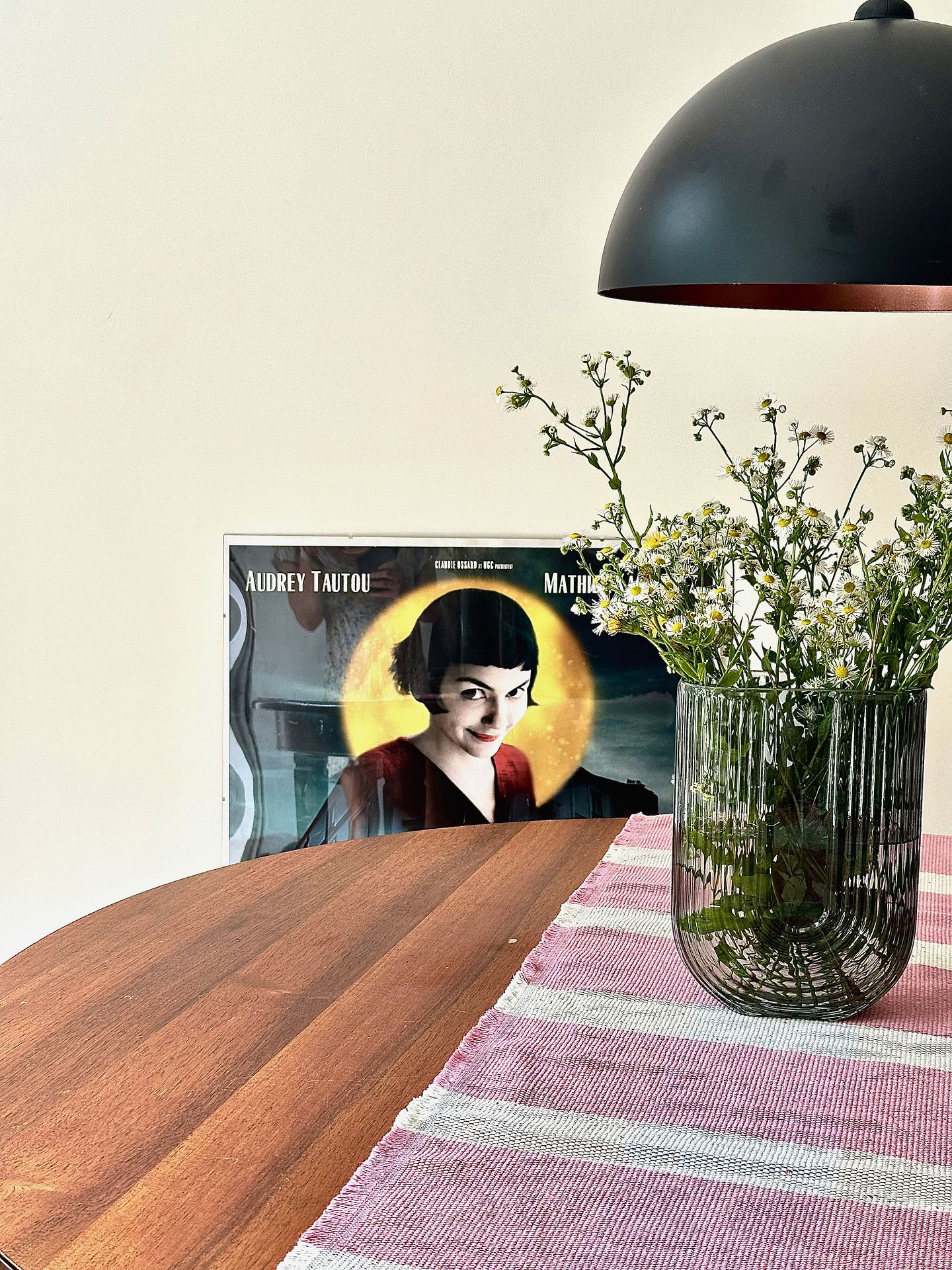 Jadalnia z drewnianym stołem i kwiatami