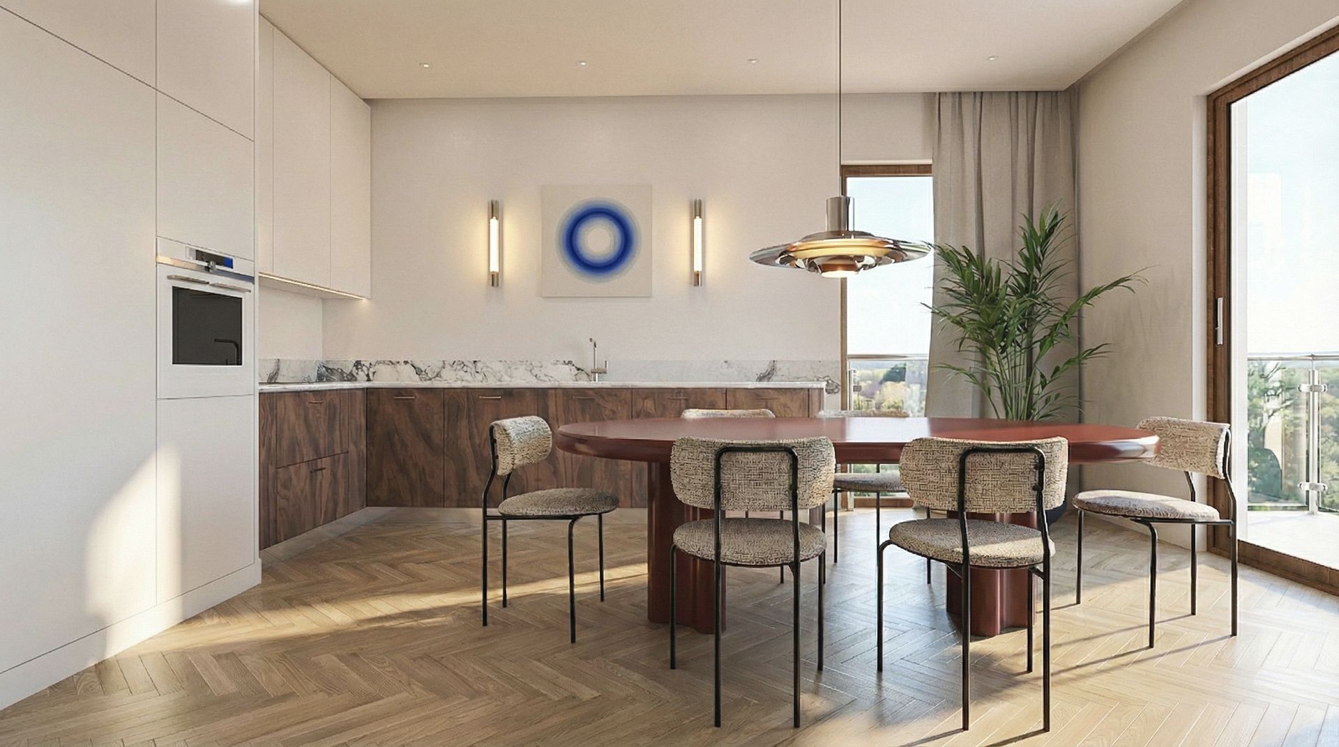 Jadalnia z okrągłym stołem i drewnianymi akcentami