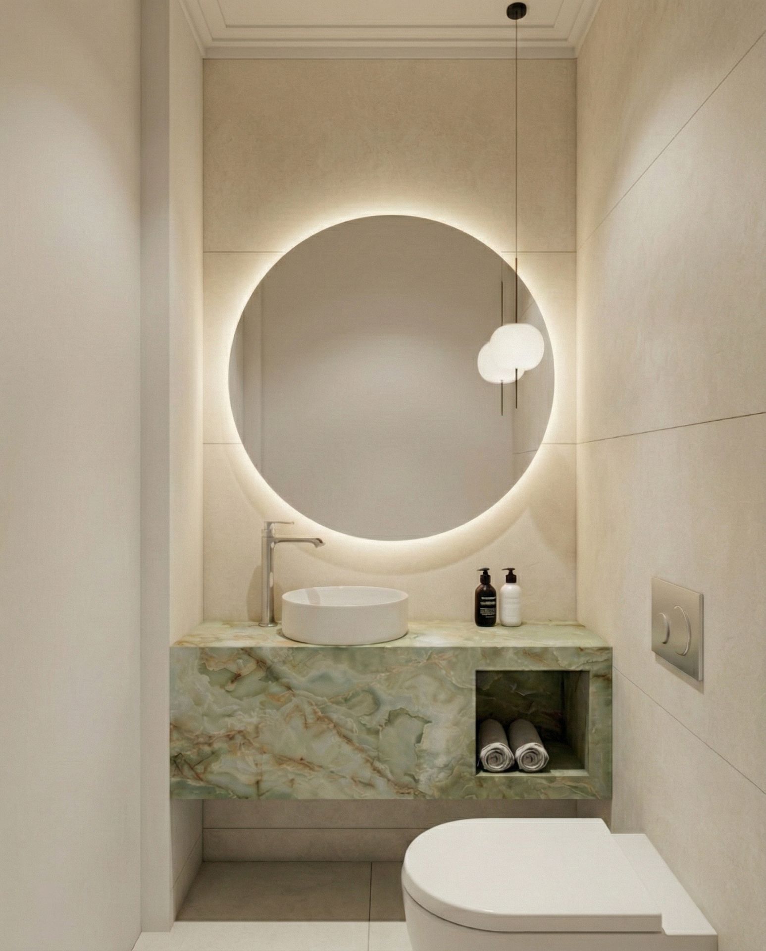 Łazienka z okrągłym lustrem i marmurową umywalką
