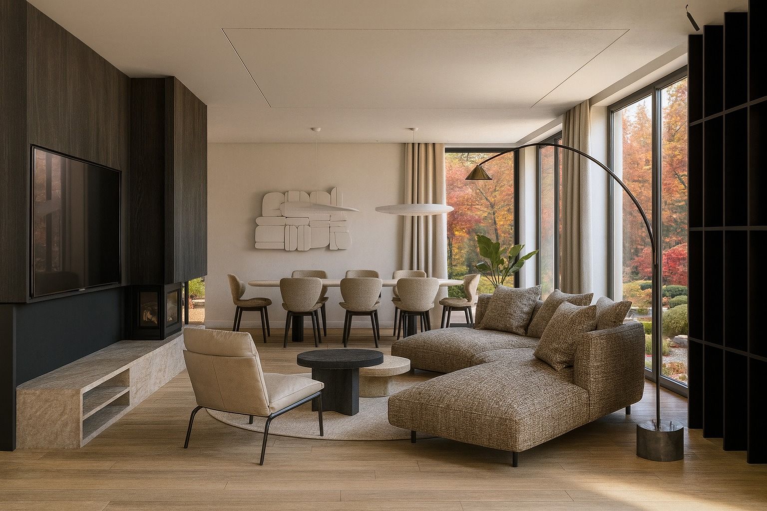 Salon z jasnymi meblami i drewnianym stołem