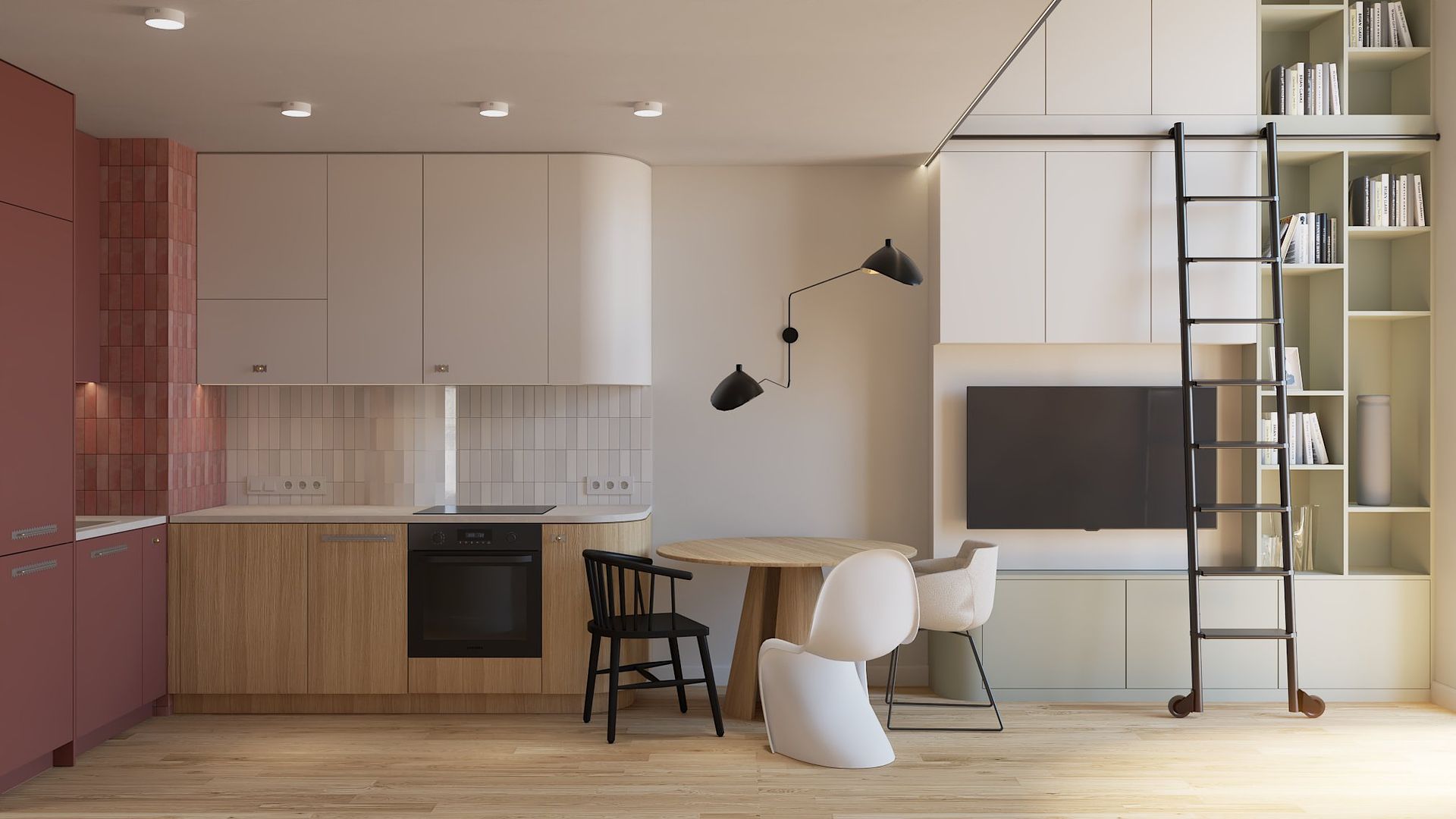 Kuchnia z drewnianymi meblami i różowymi akcentami