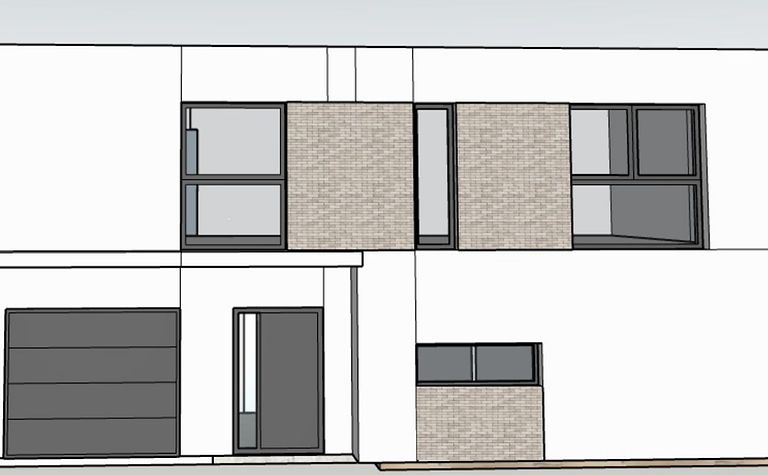 Fasada domu z dużymi oknami i ceglaną elewacją