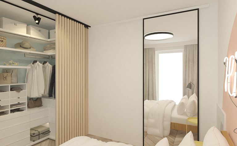 Garderoba z drewnianymi frontami i szarymi zasłonami