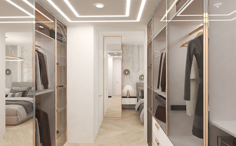 Garderoba z jasnymi meblami i marmurową podłogą