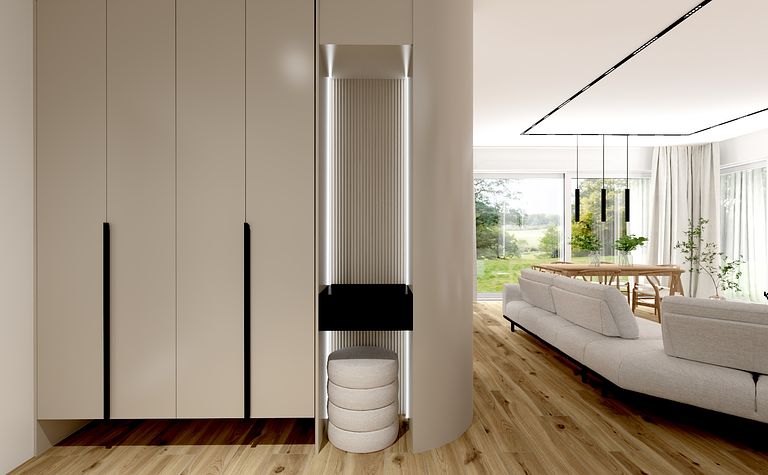 Wnętrze z jasnymi meblami i drewnianymi akcentami