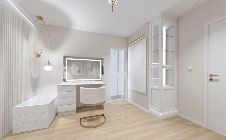 Garderoba z białymi meblami i drewnianą podłogą