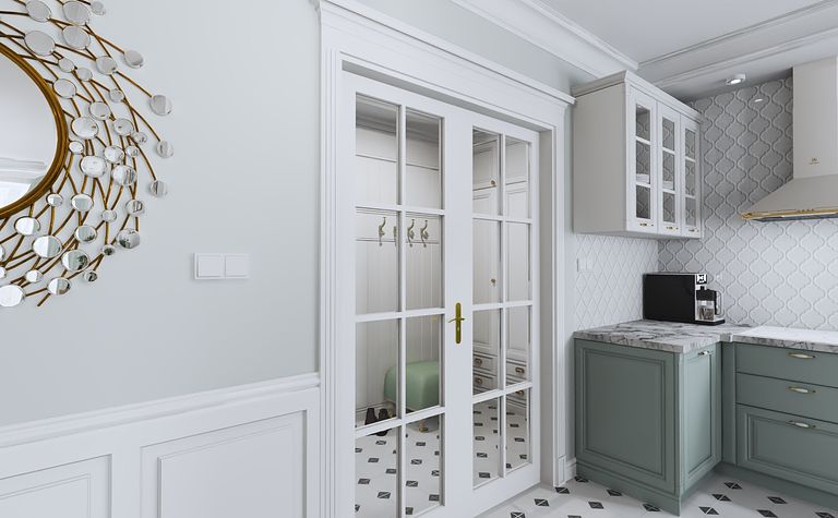 Garderoba z białymi drzwiami i zielonymi detalami
