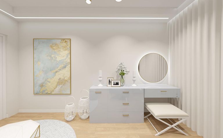 Garderoba z lustrzanym stolikiem i białą dekoracją