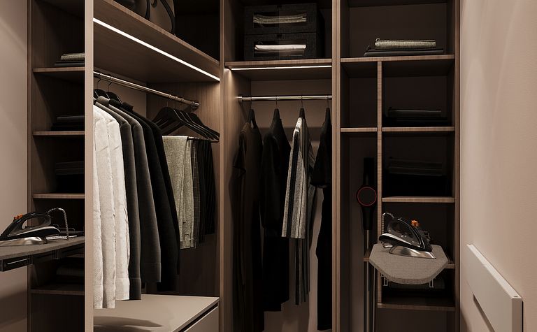 Garderoba z drewnianymi półkami i oświetleniem