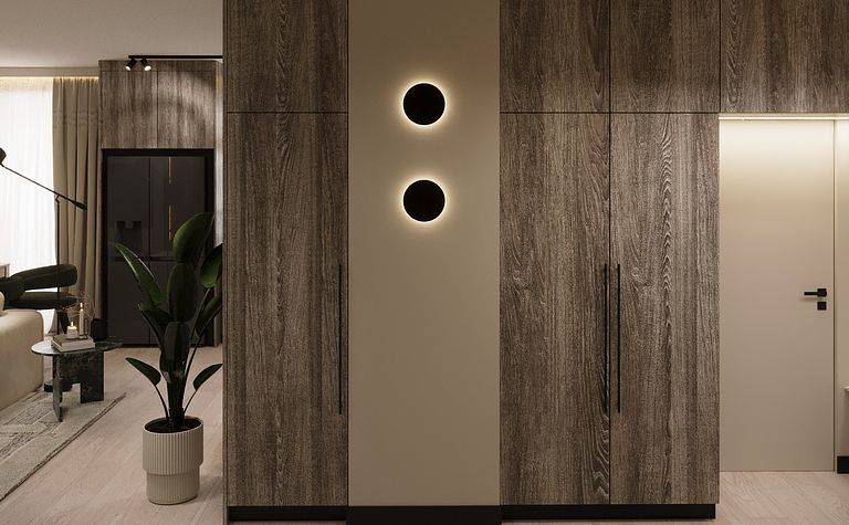 Garderoba z drewnianymi akcentami i rośliną