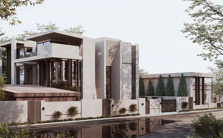 Fasada nowoczesnego domu z drewnianymi akcentami