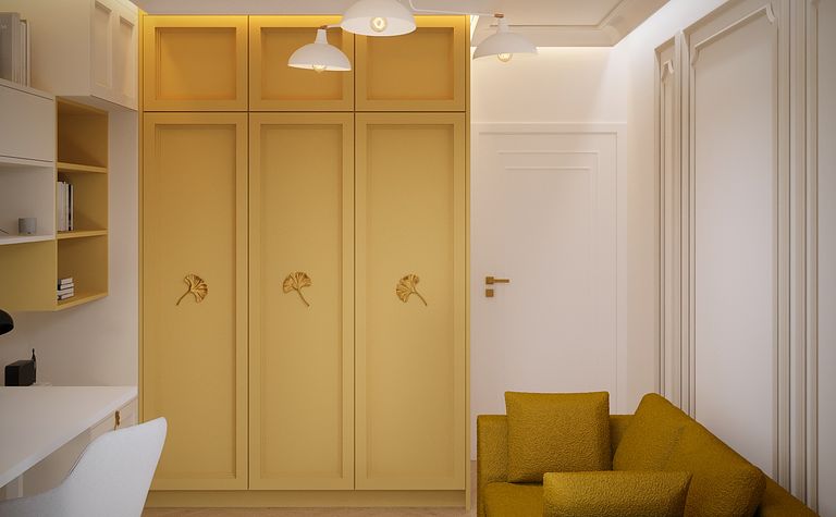 Garderoba z żółtymi szafami i białym biurkiem
