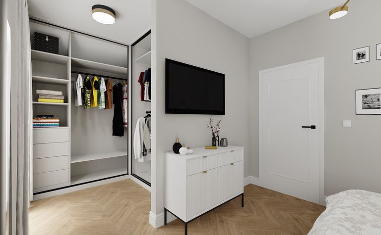 Garderoba z jasnymi meblami i drewnianą podłogą