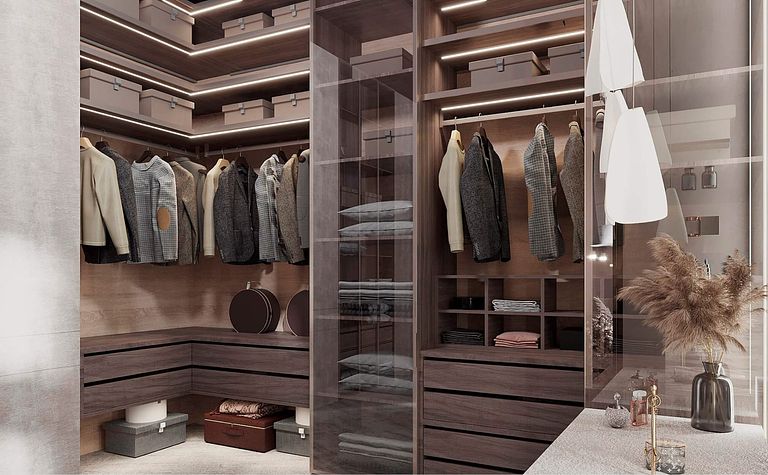Garderoba z brązowymi i szarymi akcentami