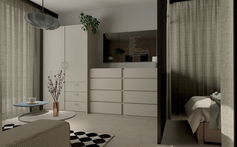 Wnętrze z dużą szafą i telewizorem na ścianie