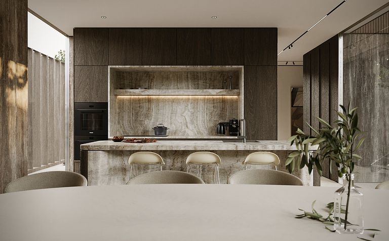 Kuchnia z drewnianymi meblami i kamiennym blatem