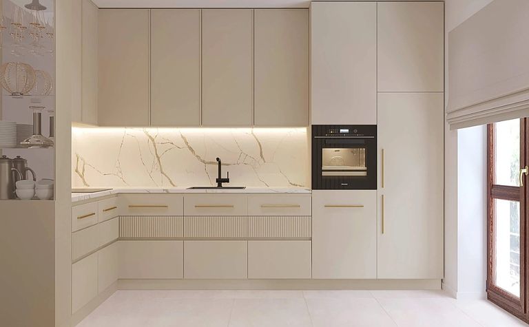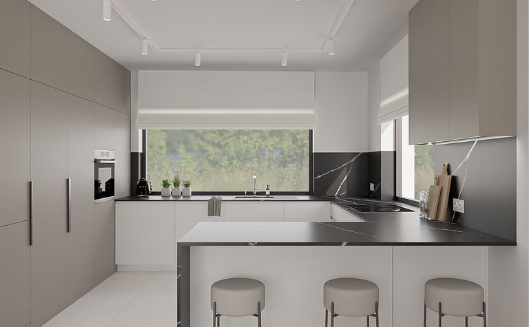 Kuchnia z beżowymi meblami i czarnymi akcentami