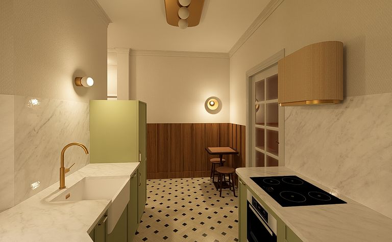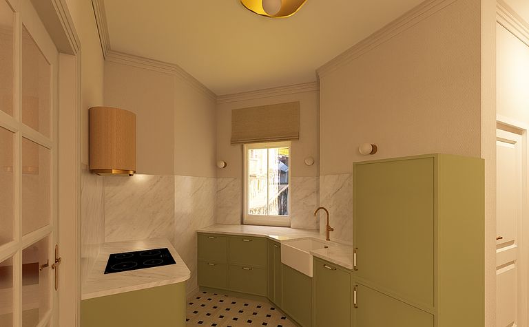 Kuchnia z zielonymi meblami i marmurowym blatem