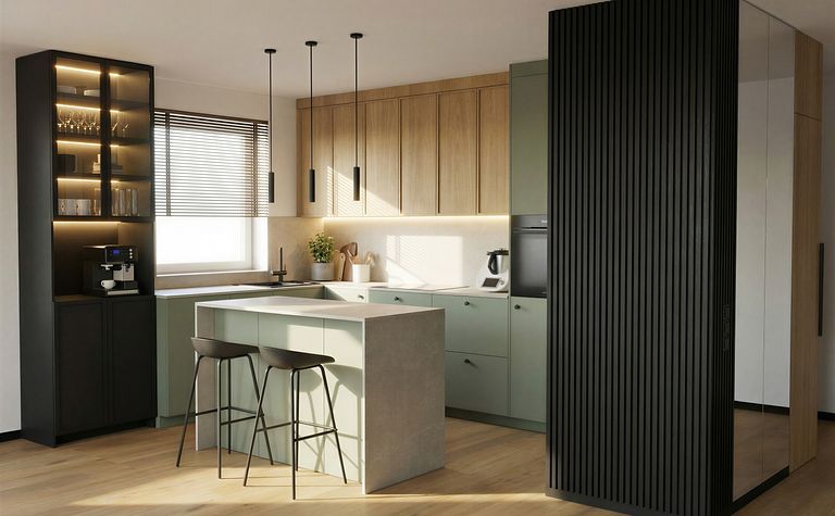 Kuchnia z zielonymi meblami i drewnianymi akcentami
