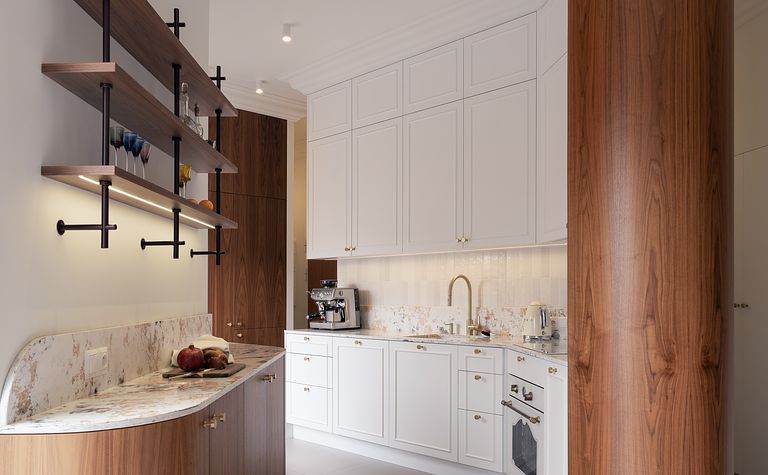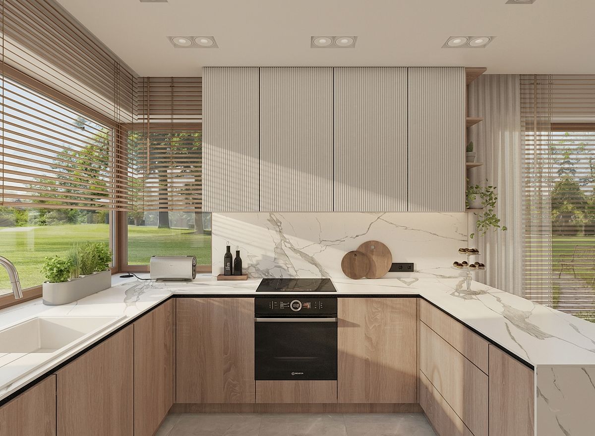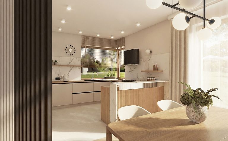 Kuchnia z drewnianymi elementami i jasnymi meblami
