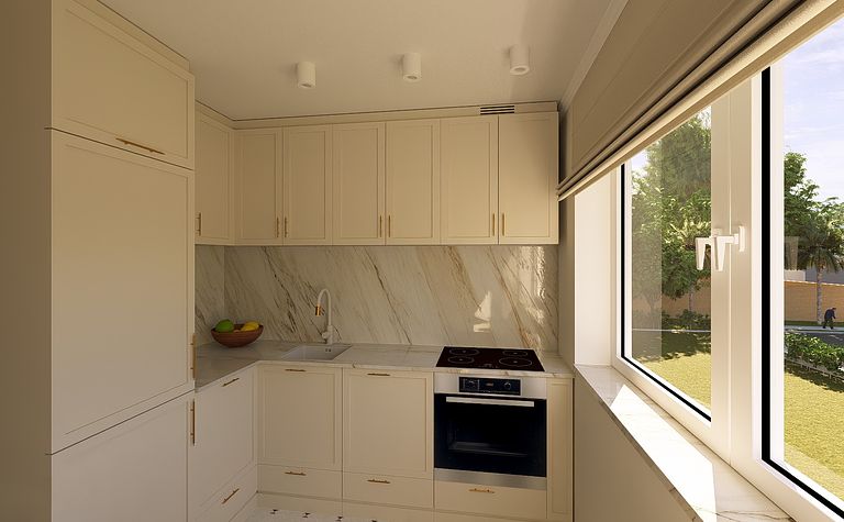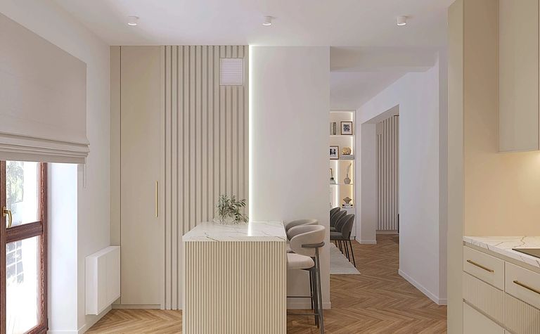 Kuchnia z beżowymi meblami i drewnianymi akcentami