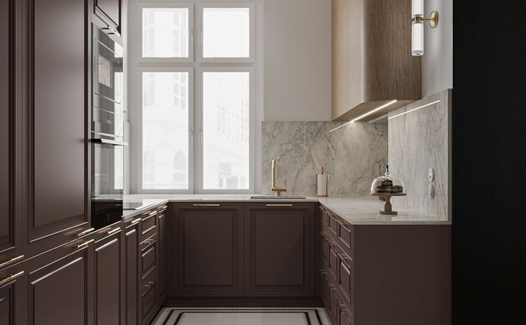 Kuchnia z ciemnymi meblami i marmurowym blatem