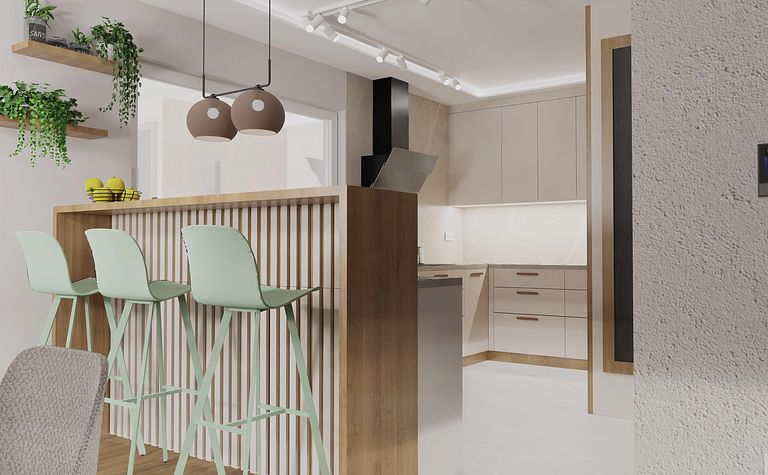 Kuchnia z drewnianymi akcentami i zielonymi krzesłami