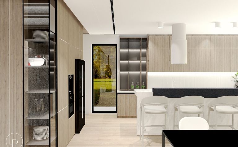 Kuchnia z drewnianymi meblami i czarnymi akcentami