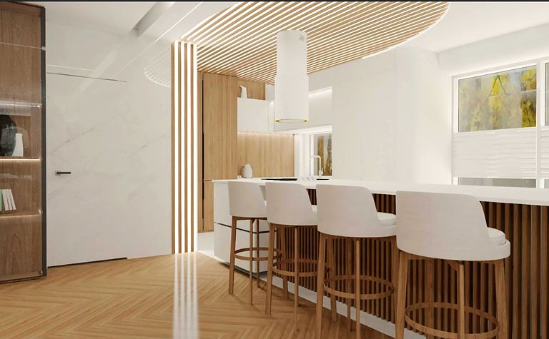 Kuchnia z drewnianymi akcentami i białymi meblami