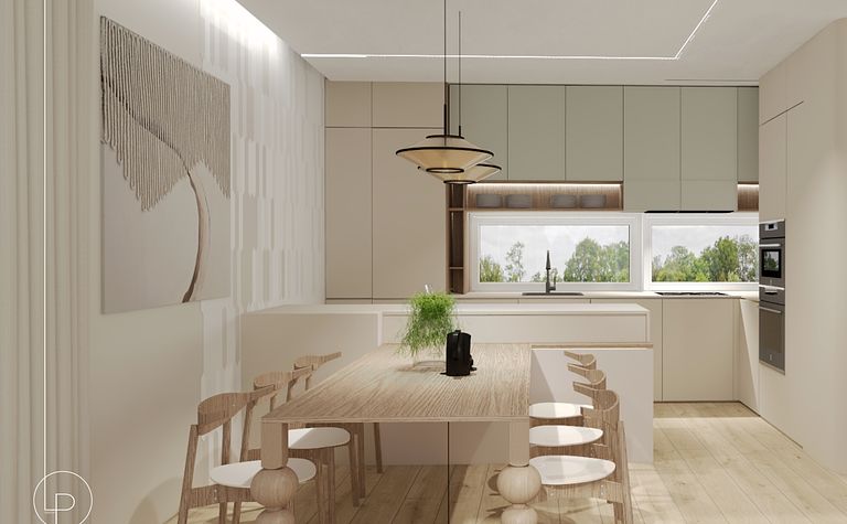 Kuchnia z jasnymi meblami i drewnianym stołem