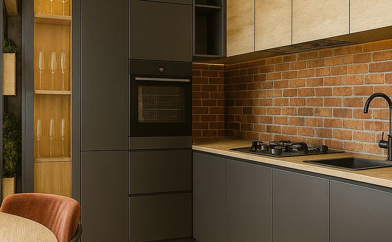 Kuchnia z czarnymi meblami i ceglaną ścianą