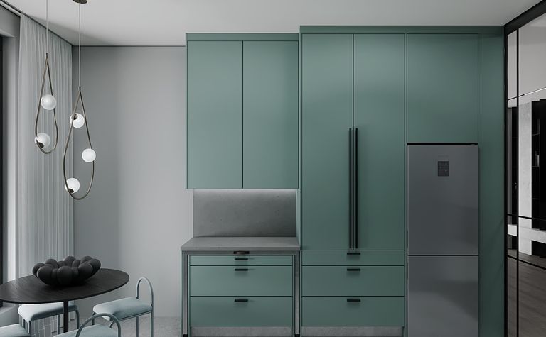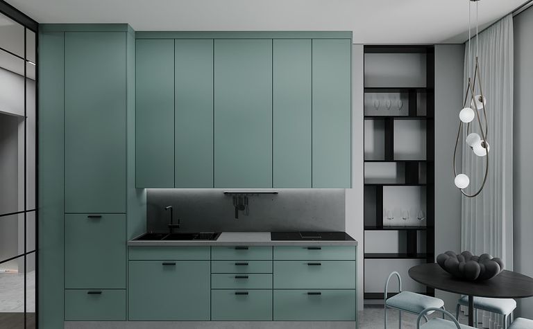 Kuchnia z zielonymi meblami i szarymi akcentami