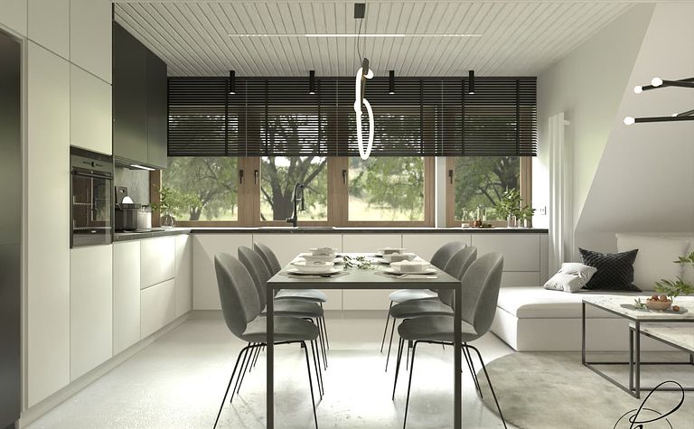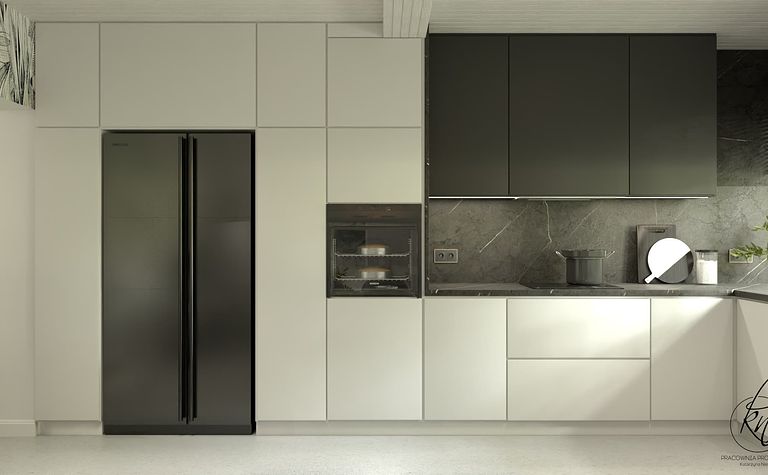 Kuchnia z jasnymi meblami i czarnymi akcentami