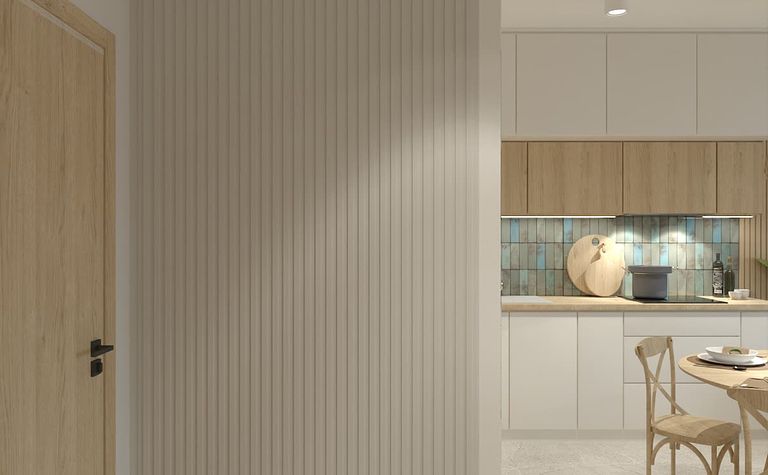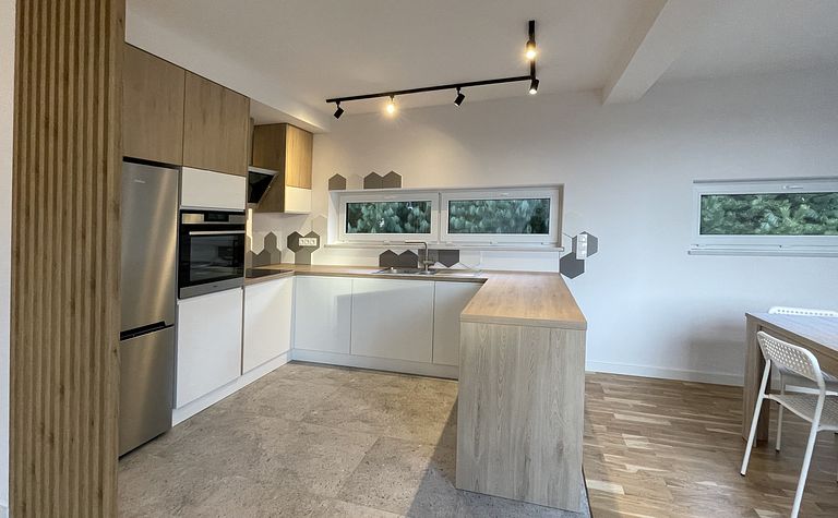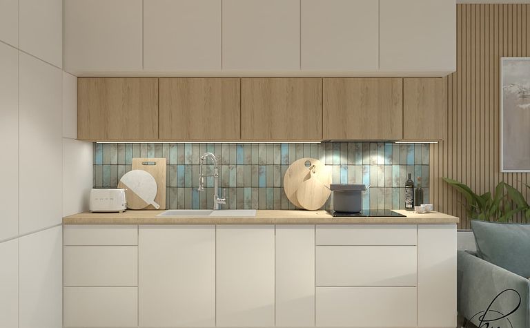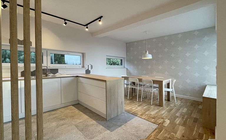 Kuchnia z drewnianymi akcentami i jasnymi meblami
