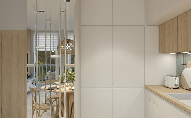 Kuchnia z jasnymi meblami i drewnianym blatem