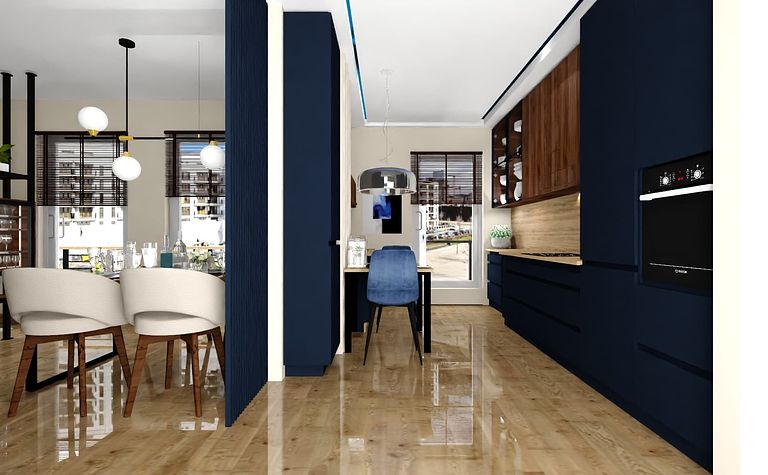 Kuchnia z drewnianymi akcentami i niebieskimi krzesłami