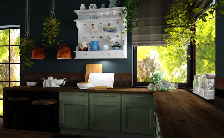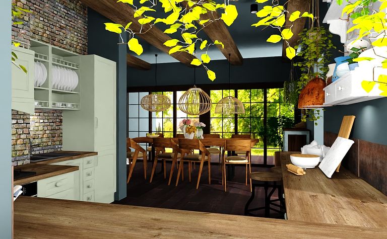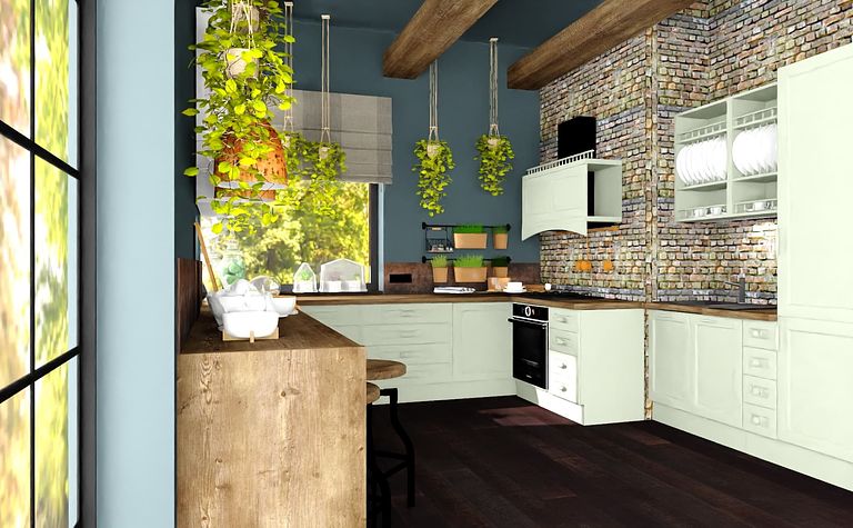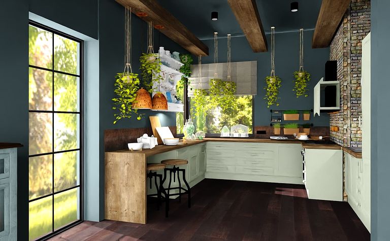 Kuchnia z drewnianymi akcentami i roślinami